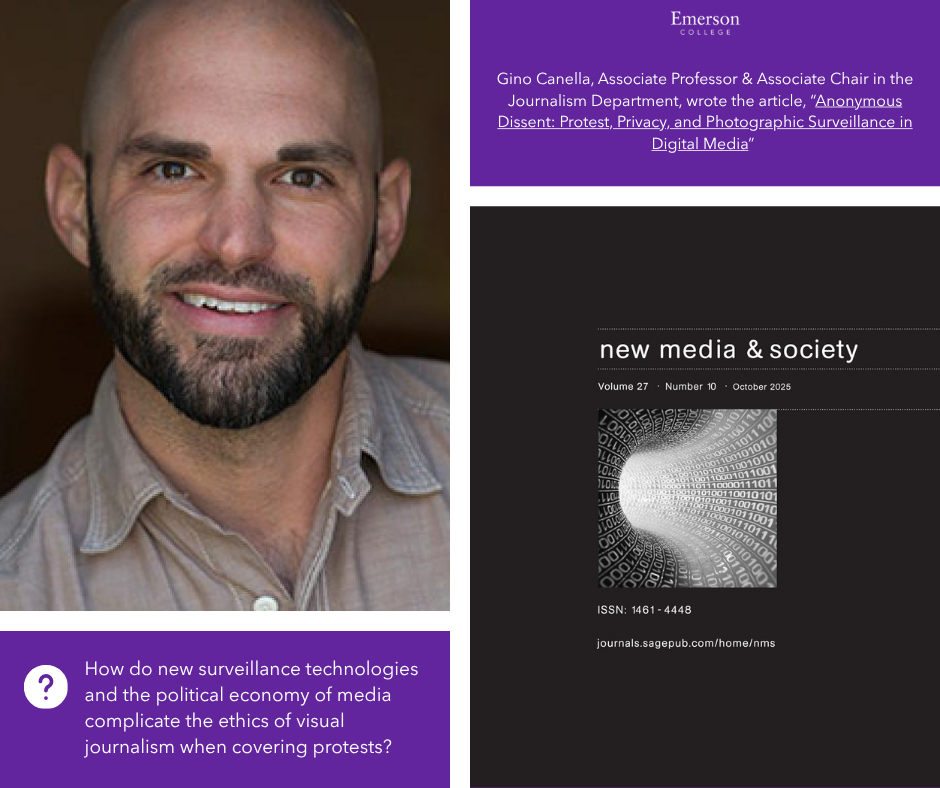 Gino Canella, Associate Professor & Associate Chair in the Journalism Department, wrote the article, “Anonymous Dissent: Protest, Privacy, and Photographic Surveillance in Digital Media” that appeared in the June 2025 issue of New Media & Society, a peer-reviewed journal published by SAGE. This article explores the nuances and challenges in ethical journalism as new surveillance technologies and the political economy of media are rapidly developing.
