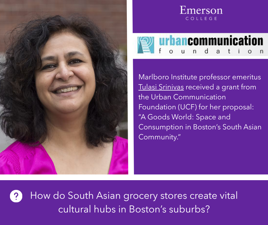 Professor emeritus Tulasi Srinivas was awarded a $1,850 research assistance grant from the UCF to examine how South Asian grocery stores create vital cultural hubs in Boston’s suburbs and are actively reshaping the suburban landscape through unique sensory, commercial, and social practices. Her research involves actively engaging in photography, mapping, and scholarship of these storefronts to contribute to UCF and other broader conversations on the subject of urban studies along with other hot button issues such as immigration, gentrification, mainstreaming, and cultural geography in the Boston community. Srinivas found that these local storefronts challenge standardized American foodscapes while also fostering community, cultural continuity, and urban transformation.