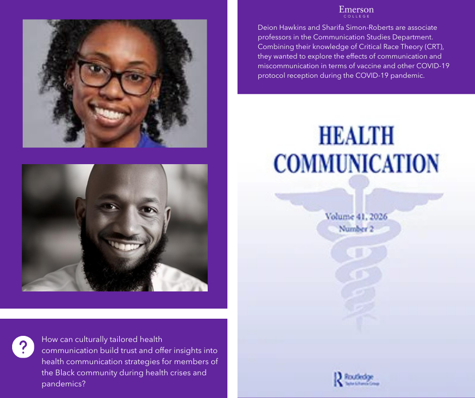 Deion Hawkins and Sharifa Simon-Roberts are associate professors in the Communication Studies Department. Combining their knowledge of Critical Race Theory (CRT), they wanted to explore the effects of communication and miscommunication in terms of vaccine and other COVID-19 protocol reception during the COVID-19 pandemic. Their article: “You Have These Antibodies Waitin’ to Pop Off: Black Amplification Rhetorics in Tyler Perry’s COVID-19 Vaccine Special” is available in the journal of Health Communication.