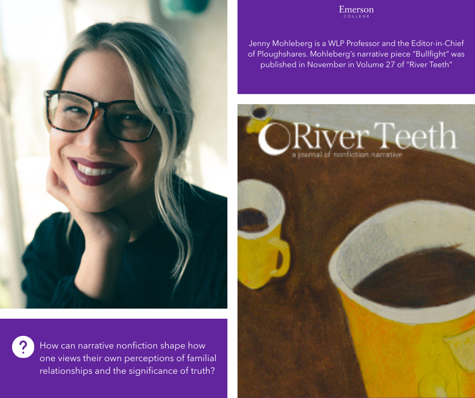 Jenny Mohleberg is a WLP Professor and the Editor-in-Chief of Ploughshares. Mohleberg’s narrative piece “Bullfight” was published in November in Volume 27 of River Teeth: A Journal of Nonfiction Narrative by Ball State University. The narrative nonfiction piece explores intergenerational trauma and critiques on survival narratives in a patriarchal society.