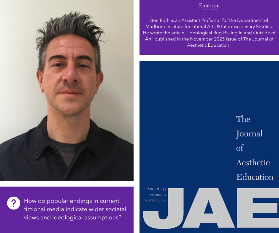 Ben Roth is an Assistant Professor for the Department of Marlboro Institute for Liberal Arts & Interdisciplinary Studies. He wrote the article, “Ideological Rug-Pulling In and Outside of Art” published in the November 2025 issue of The Journal of Aesthetic Education. The article takes an analytical approach to popular media narrative endings through the lens of ideological assumptions.
