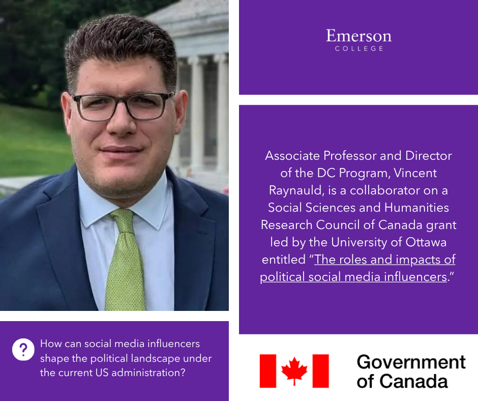 Communications Studies Department Associate Professor and Director of the DC Program, Vincent Raynauld, is a collaborator on a Social Sciences and Humanities Research Council of Canada grant led by the University of Ottawa entitled “The roles and impacts of political social media influencers.” The six year $184,000 grant ($252,000 in Canadian dollars) will study how social media influencers are changing the way people get their political news, and the degree of influence they have. Read more in Emerson Today.
