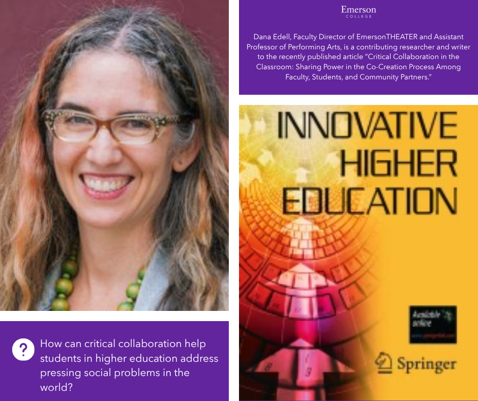 Dana Edell, Faculty Director of EmersonTHEATER and Assistant Professor of Performing Arts, is a contributing researcher and writer to the recently published article “Critical Collaboration in the Classroom: Sharing Power in the Co-Creation Process Among Faculty, Students, and Community Partners” in Innovative Higher Education. Her research explores how collaboration, partnerships, and community-engagement are increasingly important as higher education institutions face pressure to prepare students for the workforce and contribute to the public good, highlighting open listening, recognition of diverse forms of expertise, clarity of shared outcomes, and collective decision making as key factors in “critical collaboration.”