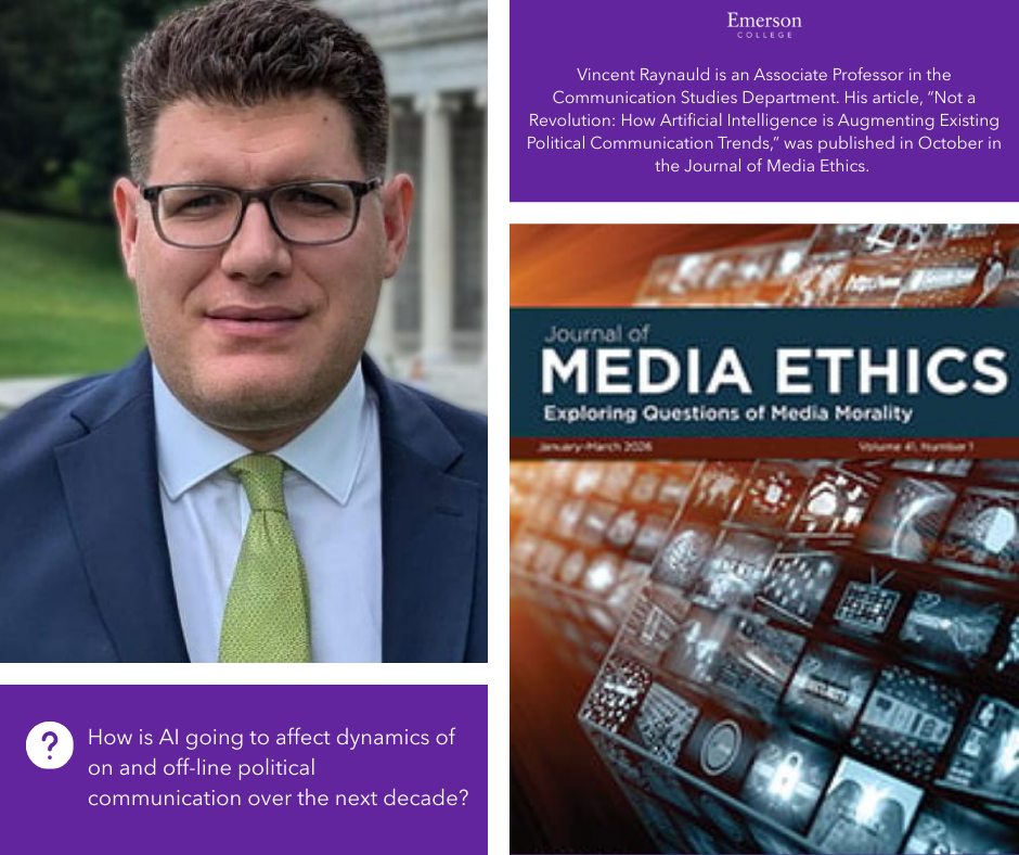 Vincent Raynauld is an Associate Professor in the Communication Studies Department. His article, “Not a Revolution: How Artificial Intelligence is Augmenting Existing Political Communication Trends,” was published in October in the Journal of Media Ethics. This article explores the possibility of artificial intelligence in the political communication and marketing industry as AI could work as a tool to enhance campaign advertisements and political messaging.