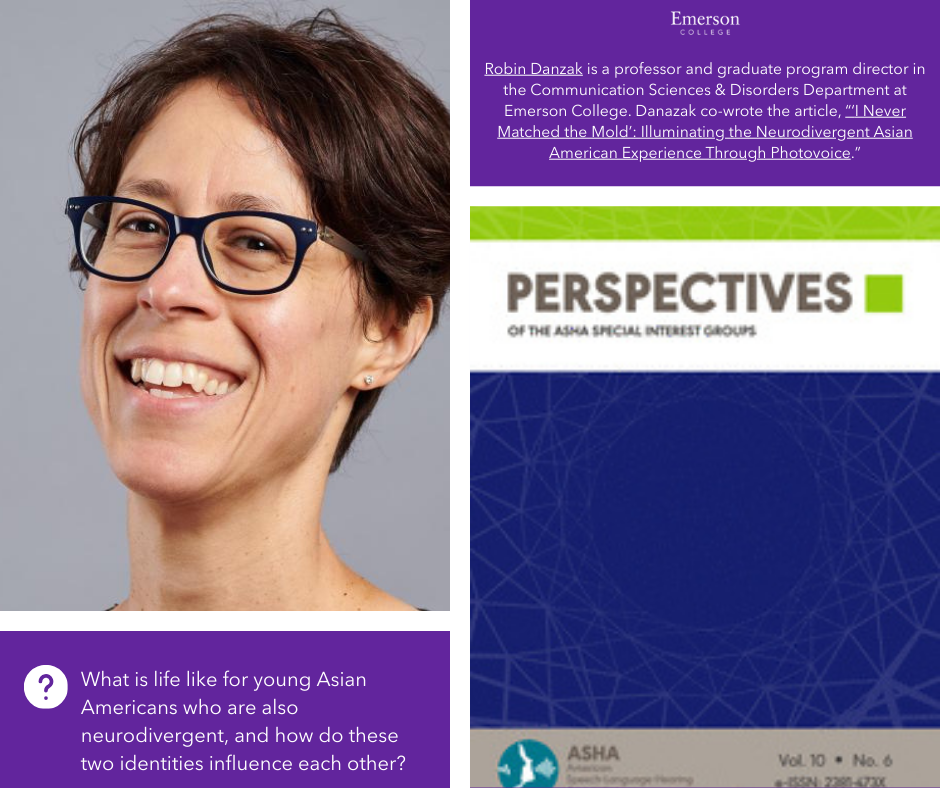 Robin Danzak is a professor and graduate program director in the Communication Sciences & Disorders Department at Emerson College. Currently, she teaches graduate and undergraduate courses in language and literacy. As a co-author for the article, “‘I Never Matched the Mold’: Illuminating the Neurodivergent Asian American Experience Through Photovoice,” Danzak examines the intersection of identity between the Asian American and the neurodivergent experience, seeing the ways in which both impact the lives of emerging adults and their experiences.