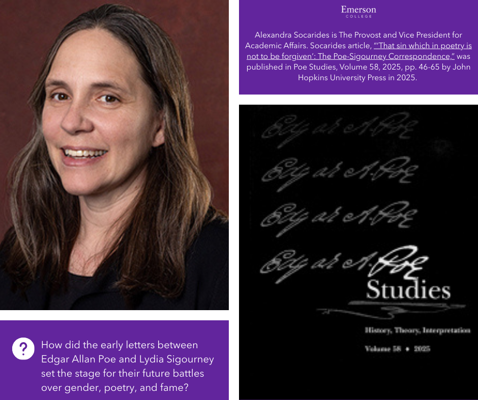 Alexandra Socarides is The Provost and Vice President for Academic Affairs. Socarides article, “‘That sin which in poetry is not to be forgiven’: The Poe-Sigourney Correspondence,” was published in Poe Studies, Volume 58, 2025, pp. 46-65 by John Hopkins University Press in 2025. This article explores the nature and influence of Edgar Allan Poe and Lydia Sigourney’s early correspondence in the context of developing their legacies within the literary canon.