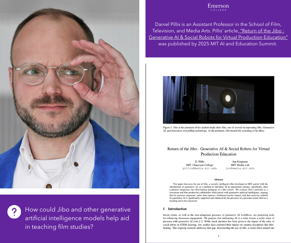 Daniel Pillis is an Assistant Professor in the School of Film, Television, and Media Arts. Pillis’ article, “Return of the Jibo : Generative AI & Social Robots for Virtual Production Education” was published by 2025 MIT AI and Education Summit. The article examines the different positive applications of MIT’s AI Jibo, especially in the role as a teaching aid in film studies classrooms.