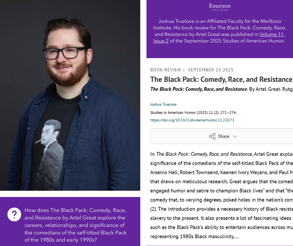 Joshua Truelove is an Affiliated Faculty for the Marlboro Institute. His book review for The Black Pack: Comedy, Race, and Resistance by Artel Great was published in Volume 11, Issue 2 of the September 2025 Studies of American Humor. Truelove examines the text within the context of the history of Black resistance humor along with the cultural identities that contributed to the movement.