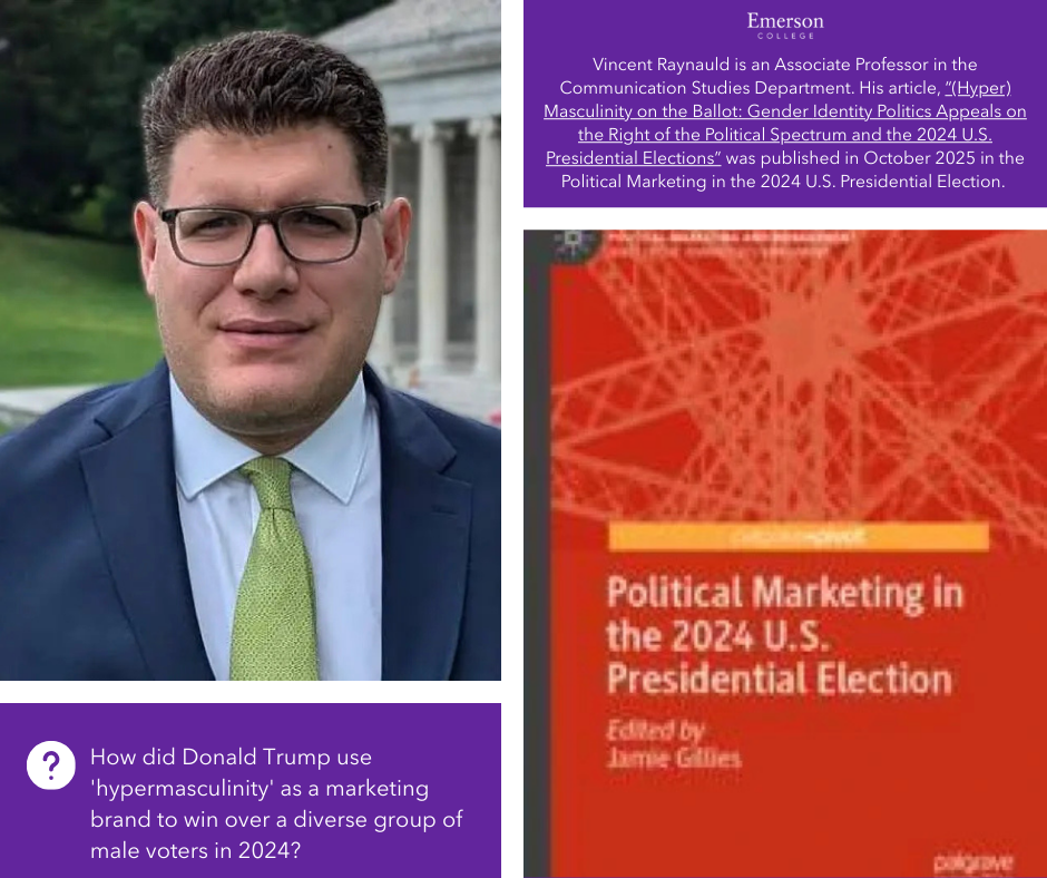Vincent Raynauld is an Associate Professor in the Communication Studies Department. His article, “(Hyper) Masculinity on the Ballot: Gender Identity Politics Appeals on the Right of the Political Spectrum and the 2024 U.S. Presidential Elections” was published in October 2025 in the Political Marketing in the 2024 U.S. Presidential Election. While most people think of “identity politics” as something used by the political Left (focusing on race, gender, or orientation), this article looks at how the political Right used gender identity—specifically “being a man”—to build a winning coalition.