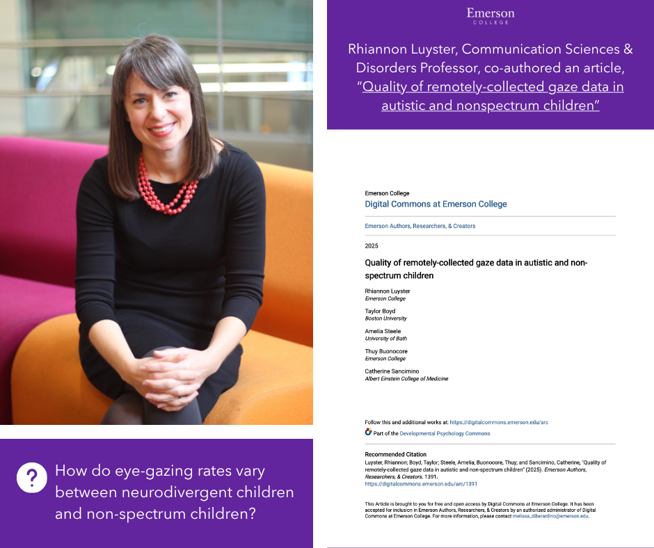 Rhiannon Luyster, Communication Sciences & Disorders Professor, co-authored an article, “Quality of remotely-collected gaze data in autistic and non-spectrum children,” which appeared in the June 2025 issue of Language Development Research, an open-access peer-reviewed journal out of Carnegie Mellon University. Her research explores her eye-gazing data collection on autistic and non-spectrum children and the applications it has to her previous research.