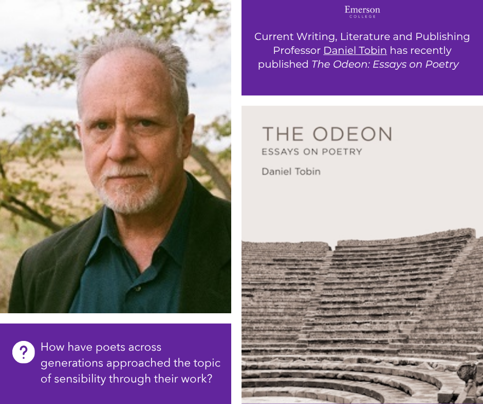 Current Writing, Literature and Publishing Professor Daniel Tobin has recently published The Odeon through Louisiana State University Press. His essays focus on a wide variety of writers, ranging from John Donne and Emily Dickinson to writers from the twenty-first century such as Mark Doty, Louise Glück, and Carl Phillips. With the central question of “sensibility” and its various social, philosophical, and aesthetic connotations, the collection presents a sequence of related essays exploring both resonances and dissonances in the traditions of modern and contemporary poetry. Professor Tobin received indexing support for this book from the Hub Fund for Advancing Research.