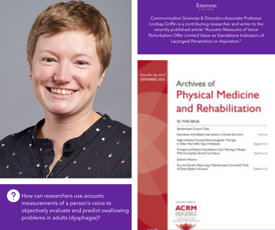 Communication Sciences & Disorders Associate Professor Lindsay Griffin is a contributing researcher and writer for the article “Acoustic Measures of Voice Perturbation Offer Limited Value as Standalone Indicators of Laryngeal Penetration or Aspiration” that was published in the September 2025 issue of the peer-reviewed journal: Archives of Physical Medicine and Rehabilitation by Elsevier on behalf of the American Congress of Rehabilitation Medicine. Current Emerson students interested in gaining research experience with adult swallowing disorders are encouraged to contact the EATS Lab.