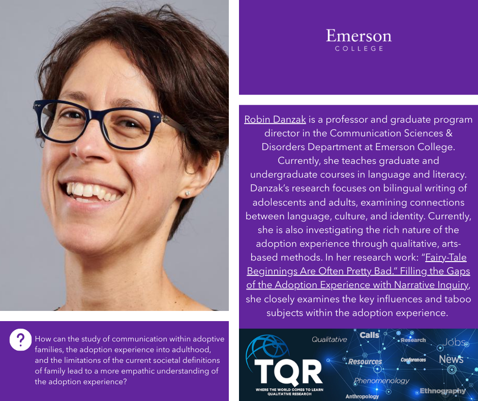 Robin Danzak is a professor and graduate program director in the Communication Sciences & Disorders Department at Emerson College. Currently, she teaches graduate and undergraduate courses in language and literacy. Danzak’s research focuses on bilingual writing of adolescents and adults, examining connections between language, culture, and identity. Currently, she is also investigating the rich nature of the adoption experience through qualitative, arts-based methods. In her research work: “Fairy-Tale Beginnings Are Often Pretty Bad.” Filling the Gaps of the Adoption Experience with Narrative Inquiry, she closely examines the key influences and taboo subjects within the adoption experience.