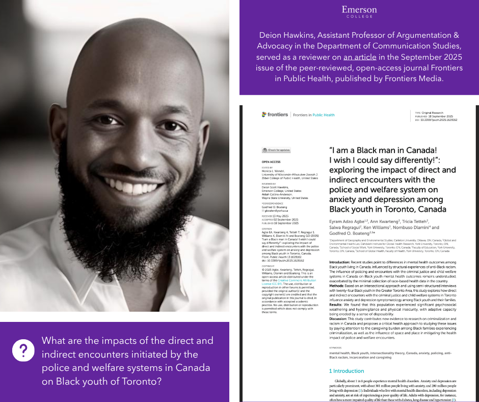 Deion Hawkins, Assistant Professor of Argumentation & Advocacy in the Department of Communication Studies, served as a reviewer on an article in the September 2025 issue of the peer-reviewed, open-access journal Frontiers in Public Health, published by Frontiers Media.