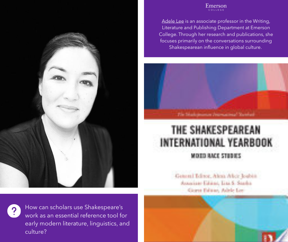 Adele Lee is an associate professor in the Writing, Literature and Publishing Department at Emerson College. Through her research and publications, she focuses primarily on the conversations surrounding Shakespearean influence in global culture. Her work as a guest editor on “The Shakespearean International Yearbook: Mixed Race Studies” is her latest exploration into the influence Shakespearean text had on the development of modern literature, linguistics, and culture.